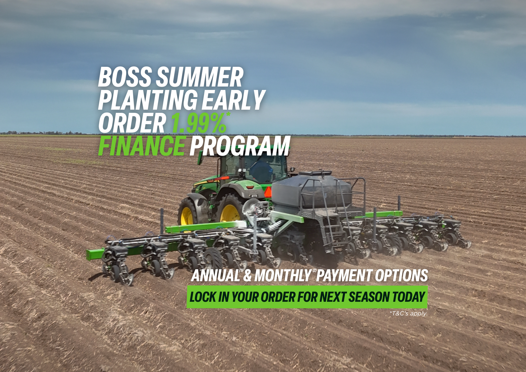Secure your next-season planting system now with BOSS’s exclusive early-order finance program at just 1.99% p.a. Available for Australian growers with ABNs, this limited-time offer lets you lock in your 2026 build and spread costs with annual or monthly payment options.